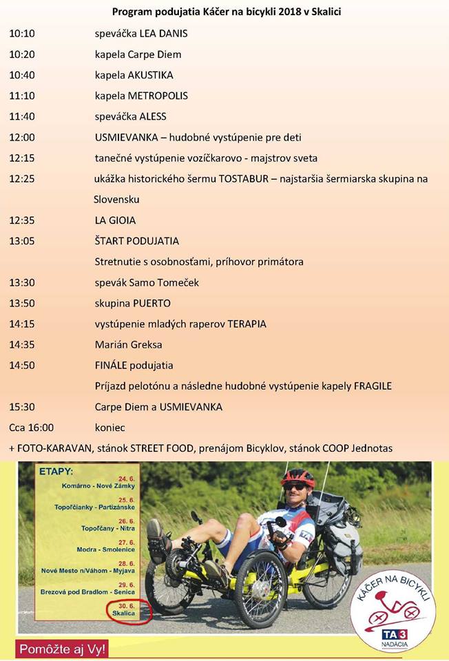 Ide o handikapovaného cyklistu Petra Káčera, ktorý jazdí za nadáciu TA3, v sobotu 30.06.2018 príde do Skalice, aby tuná jazdil mestský okruh. Štart cyklojazdy bude v sobotu 30.06.2018 o 13:00 hod na Námestí slobody (okruh Námestie - Kráľovská - Komenského - Madvova - Jezuitská - Námestie - Štefánikova - celá Potočná a späť cez Štefánikovu na Námestie slobody), okruh je dĺžky 3km a bude sa jazdiť viac razy (cca 5x), ku cyklojazde sa môže zapojiť široká verejnosť na bicykloch.