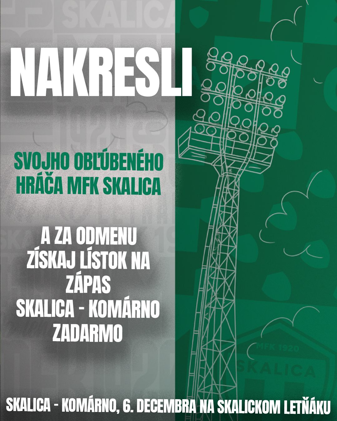 Nakreslite nám obrázok vášho obľúbeného hráča z kádra MFK Skalica, odfoťte ho a pošlite nám ho do súkromnej správy na Facebooku, Instagrame, alebo na mail pr@mfkskalica.sk. My vám za odmenu pošleme zadarmo lístok na posledný domáci zápas jesene MFK Skalica – KFC Komárno, ktorý odohráme v sobotu 6. decembra o 15.30 hodine.